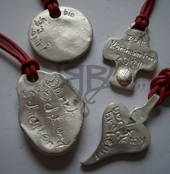 Für jeden kinderleicht umsetzbar ist das dank der formbaren Silbermasse Art Clay, welche wie Ton geformt und durch Brennen zu Silber verdichtet wird. Die „Schauseite“ kann frei modelliert oder mit Hilfe zahlreicher Stempel und Model gestaltet werden.